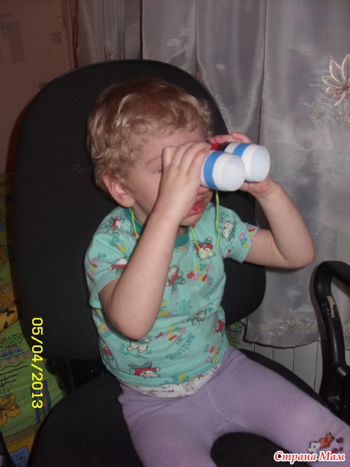 Из пустых бутылочек из под питьевого йогурта сделала ребенку бинокль, обсуждали с ним что это такое и для чего нужен. Все это объиграли, Митя был капитан и смотрел вдаль. А вообще, так ему это дело понравился, что он дня два был в образе и даже мультики смотрел через бинокль ))))