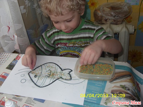Пытались сделать насыпную аппликацию. Вообще, с аппликациями туго, Митя все время пытается оторвать приклеенные детали и злиться, когда клеим. Я даже отстала от этого дела до лучших времен.