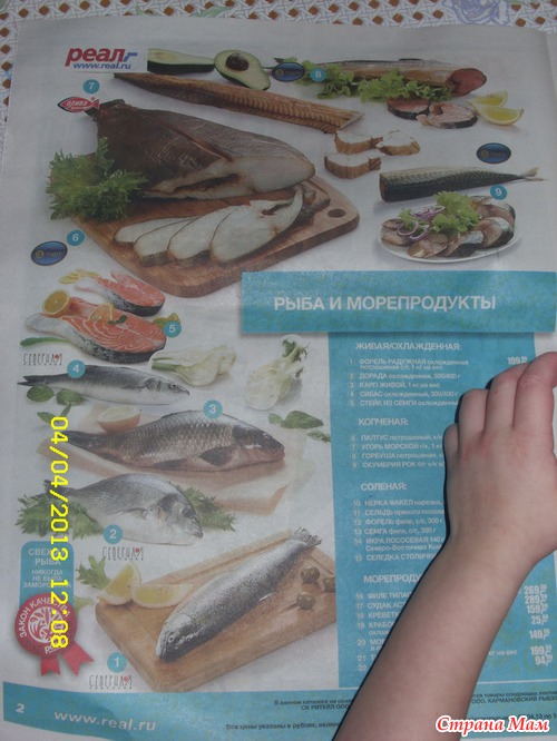 Еще так получилось смешно )) дай думаю газету подстелю на стол, чтоб не извозить. беру нашу местную, открываю на первой попавшейся страницы, а там... реклама рыбной продукции. Судьба!!! )))))))