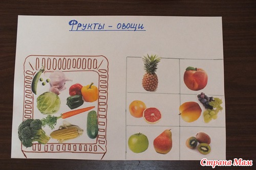Самостоятельно Андрюша наклеил овощи (иногда допускал ошибки при выборе, но вместе мы вспоминали вкус и все становилось на свои места). А вот с фруктами пришлось помочь, устал сыночек клеить.
