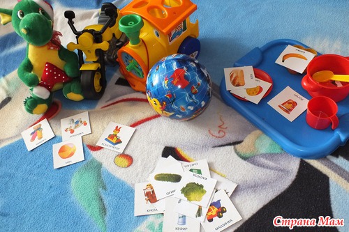 Вечером поиграли в съедобное - несъедобное. Для первого раза взяли картинки продуктов и игрушек.