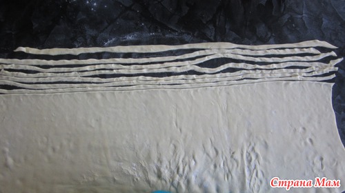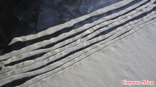 Слоеное тесто раскатать и нарезать на длинные узкие полосочки