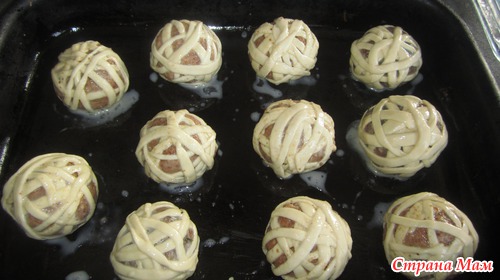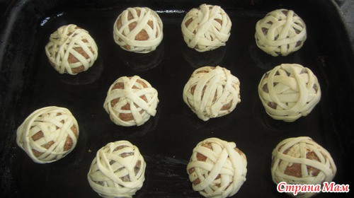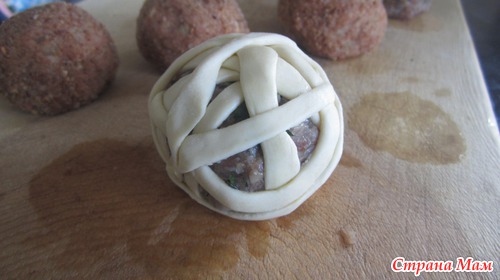 Каждый мясной шарик обмотать в хаотичном порядке (на один у меня ушло 2 полоски)