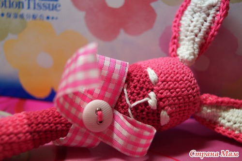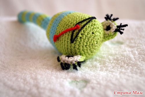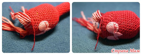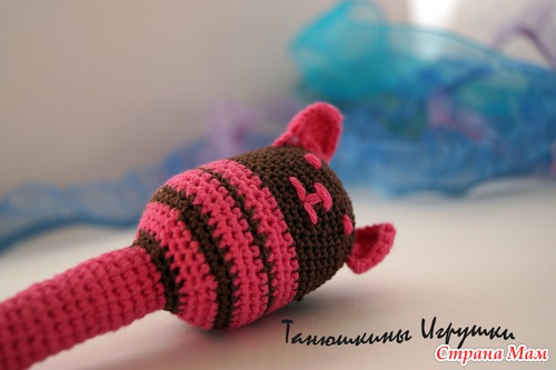 Берем нашу тушку, нитки из которых вязали погремуху, либо подходящие по цвету...