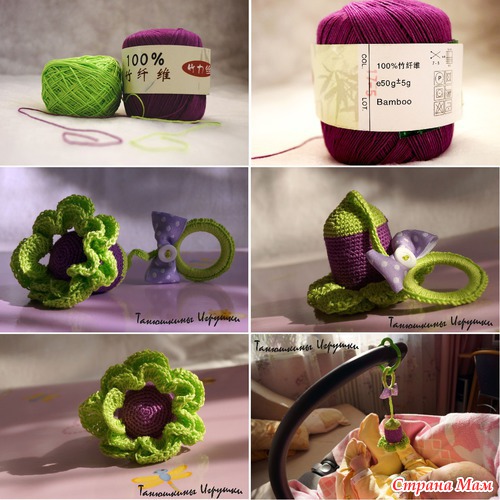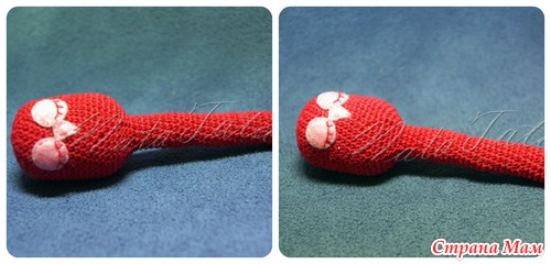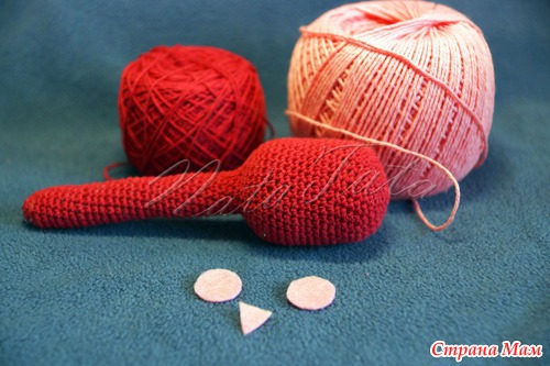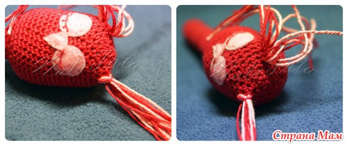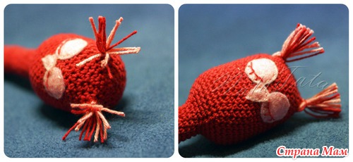 Берем нашу тушку, нитки из которых вязали погремуху, либо подходящие по цвету...