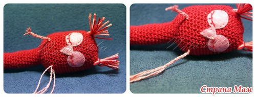 пришиваем заготовки к тушке, швом "назад иголку", этим же швом вышиваем закрытые глазки (можно сделать глазки открытыми, пришив зрачки из фетра)...
