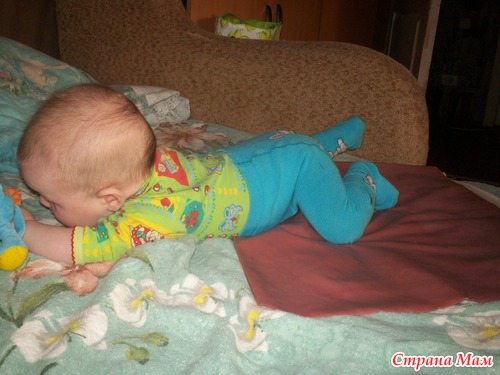 Мы научились переворачиваться со спины на живот и обратно. Пытаемся ползти, поднимаем ноги и толкается ими.