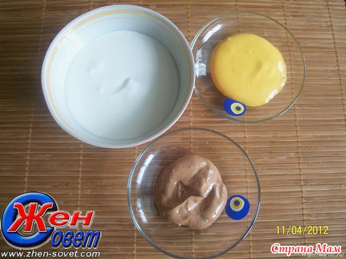 Оставить подходить тесто на 2,5 часа в теплом месте. Если тесто плохо подходит, за пол часа до выпекания, поставьте формочки с тестом сверху разогретой духовки и накройте бумажным полотенцем. Они поднимутся и выпекайте до готовности. Дать остыть и аккуратно вынуть кулич из формы. Взбить белки с сахаром в крутую пену. Небольшие части взбитых белков смешать с какао, отваром шпината, куркумой.