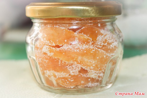 Оставьте на сутки в сиропе и опять поварите 5 минут. Из горячего сиропа выньте дольки и положите на пергамент остывать.