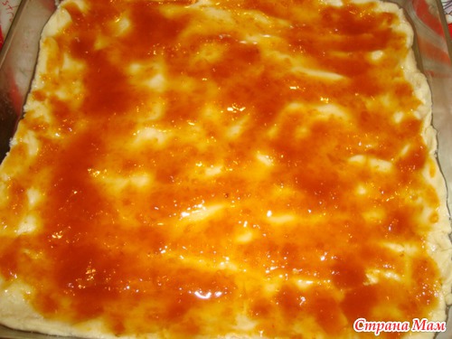 Добавить муку сколько возьмет. Тесто распределим на противен смазанный маслом.