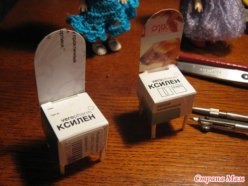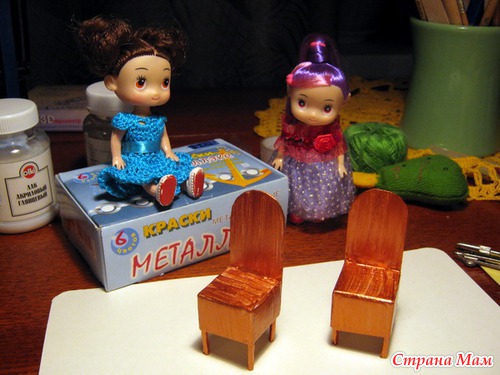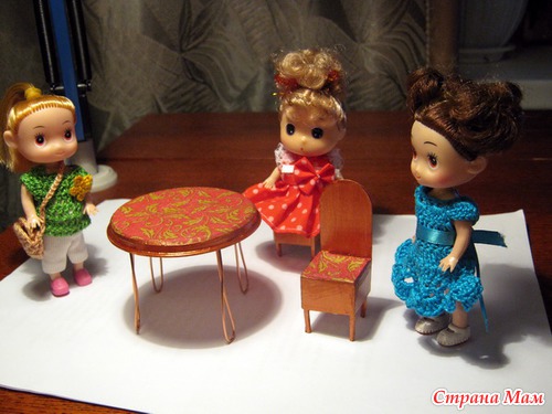 Пришлось обзаводиться мебелью "на скорую руку". Столешница для столика- диск из коробочки с кремом. Вставлена внутрь конструкция из проволоки в виде ножек и даже запаяна для крепости. Столешницу загрунтовала белым грунтом. Приклеила салфетку клеем ПВА, края покрасила акриловой краской. Стульчики сделаны из коробочки от капель, ножки-спички, спинка из толстой бумаги от упаковки колготок. Всё скреплено клеевым пистолетом(чудная вещь!), покрашено акриловой краской, на сиденье сделан декупаж салфеткой.