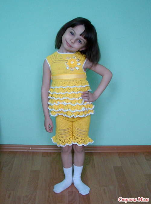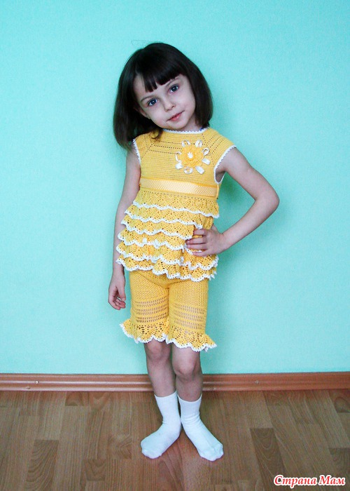 Боже мой ну что же вы творите, я еще от вашего зеленого комплектика не отошла все ночами не сплю хочу связать, а тут вы еще такой красоты навязали, да я теперь вообще пока все не свяжу вообще спать не буду А вы бы не могли пожалуйста дать описание желтенького комплекта и из какой пряжи вязали какаим крючком и сколько петель набирали на талию и обхват ножки в шортиках???