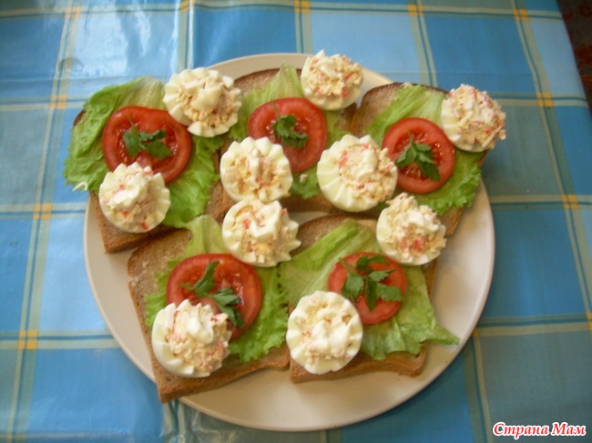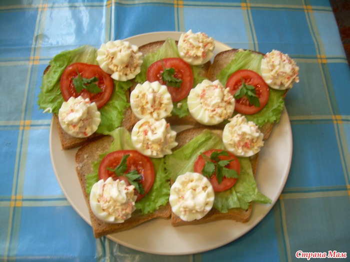 ПРОДУКТЫ: 1 упаковка крабовых палочек, 1 зубчик чеснока, 100 г майонеза, 5 яиц, черный хлеб, листья салата и помидор для украшения