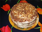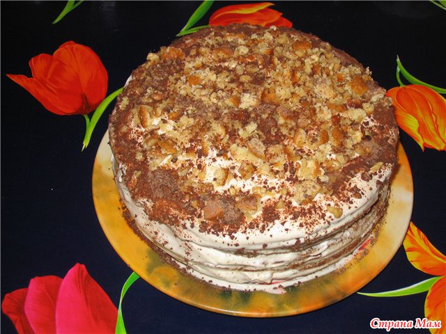 Украсить грецкими орехами и посыпать крошкой, оставшейся от обрезанных коржей.