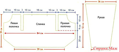 Спинка и полочки: Вязать как одну деталь. Набрать цепочку из 65 в. п. и вязать узором по схеме, соответственно выполняя прибавления. Всего прибавить 14 п. = 93 п. (выполнять прибавления с левой стороны симметрично). На высоте 20 см нитью контрастного цвета наметить детали и распределить п. след. образом: по 22 п. для каждой полочки, по 3 п. для каждой проймы и 43 п. для спинки. Продолжить вязание правой полочки. Через 10 см от начала проймы закрыть для выреза горловины в каждом р. 4 п., 3 п., 2 п. и 2 раза по 1 п. На общей высоте 39 см закончить вязание. Левую полочку связать симметрично. Возобновить вязание 43 п. спинки и на общей высоте 39 см обрезать нить.