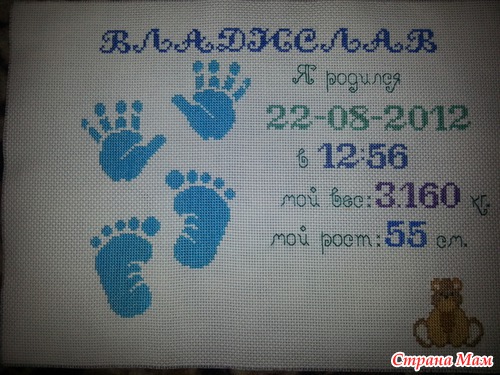 Метрика для Владислава. Схемка найдена в просторах интернета, канва Аида 14, нитки подбором. Первый раз при вышивке метрики использовала сочетание 2 шрифтов. Жду оценки работы, потому как неуверена, действительно ли это достойно смотрится.