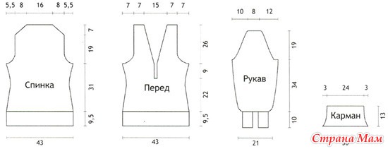 Карман: На спицы № 4 набрать 70 п. и вязать плат. вязкой, убавить с обеих сторон в каждом 2-м р. 3 раза по 1 п., в каждом 4-м р. 3 раза по 1 п. На высоте 14 см закрыть оставшиеся 58 п.