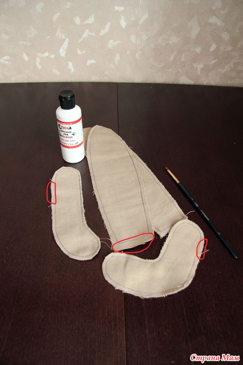 Сначала я прошиваю все части мелким стежком 2 мм, чтобы при набивке ткань не расползалась. Затем обязательно проклеиваю ткань в тех местах через которые буду выворачивать, делаю я это потому что моя ткань очень сыпется.