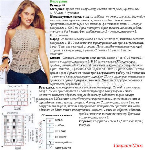 Простой на первый взгляд и очень необычный на второй - такой топ никого не оставит равнодушным. Элегантный узор, легкая полупрозрачность и приятная ниточка сделают этот топ вашей любимой летней вещью.