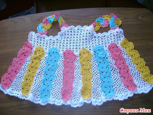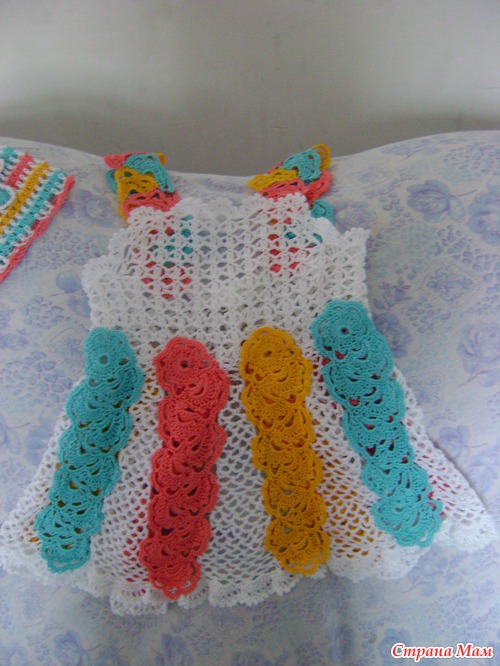 я конкретно не поняла, где именно сколько петель я набирала! так как сарафан связан можно сказать из кусочков. я вязала сначала ленты, потом клинья из сетки-все между собой сшивала- потом набирала цепочку из в.п. по талии ребенка- нам 1,10месяцев-но он немного большеват-больше как туничка.набирала 48 см длину цепочки. и потом шла вверх к кокетке-а после этого пришивала юбку к самой кокетке