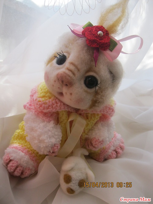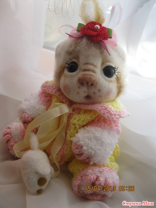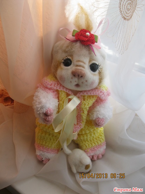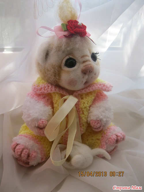 Сегодня родилась девочка Солнышко. Она бело рыженькая малышка. Так хочется солнышка и вот когда на улице наконец то появилось солнышко родилась кошечка. Малышка ростиком 22 см. Головка выполнена в технике сухого валяния. Тельце связано крючком и спицами. Выпонено все из детской фактурной пряжи. Комбинизончик снимается. Головка поворачивается. Лапки двигаются.