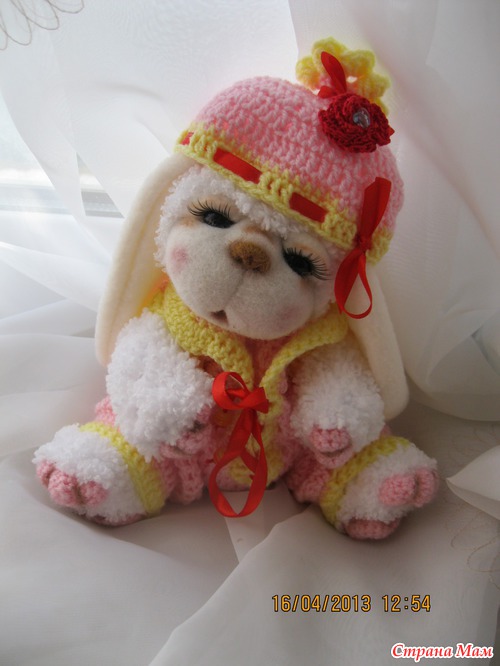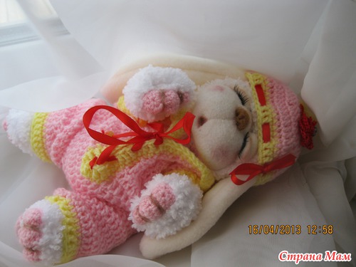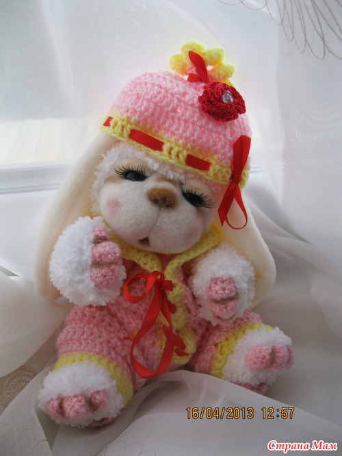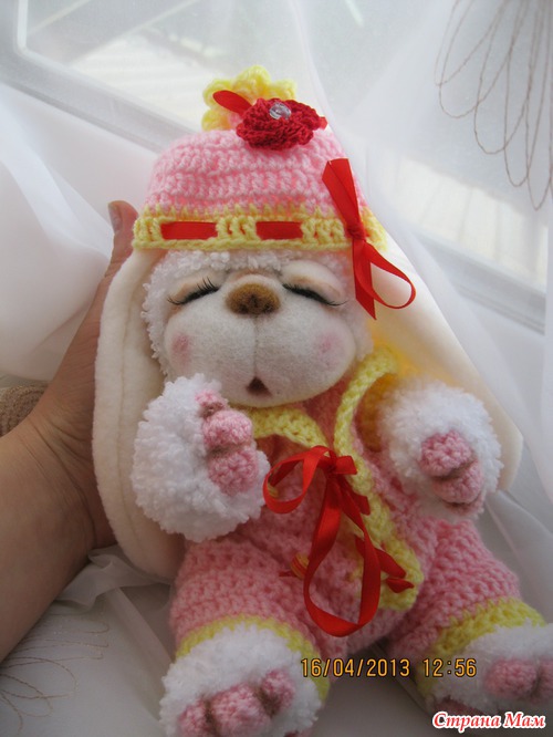 Сегодня родилась девочка Сонечка. Маленькая заюшка. Ростиком 23 см. Связана из детской фактурной пряжи. Мордочка фильц. Одежда комбинизончик и шапочка из детской пряжи и использовала бусины для украшения. Головка поворачивается и наклоняется. Лапки двигаются. Сонечка маленькая девочка и очень любит по спать. Вот она устала позировать и уснула на ручках. Глазки у нее открываются и закрываются.