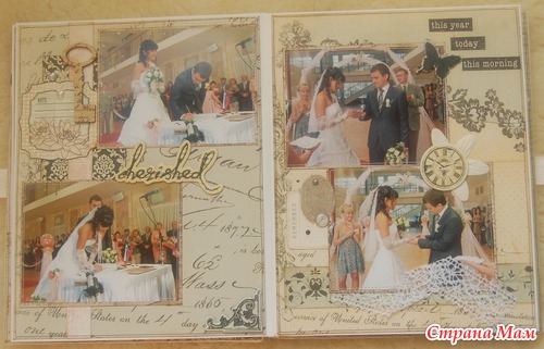Альбом получился в винтажном стиле - много кружева, часики, ключики и прочие мелочи, передающие атмосферу волшебства =)))