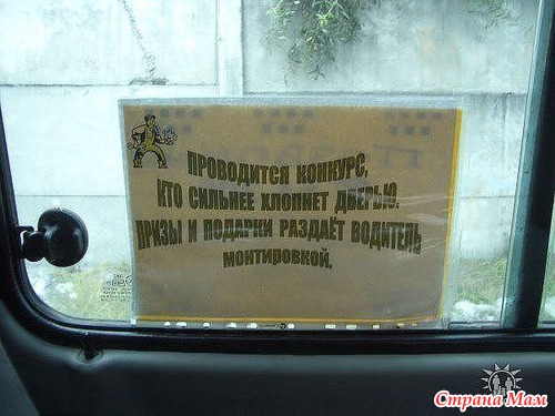 Ехала я как то на работу к мужу, сидела на переднем месте в газели. На одной остановке вышла девушка, так вот.... Она так хлопнула дверью, что у нее стекло вывалилось. Хорошо еще дверь в обратную сторону не поехала. Водитель долго в шоке был. Сидит и говорит, ВРОДЕ СЛАБЫЙ ПОЛ!!!!!!!!
