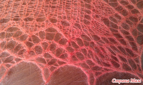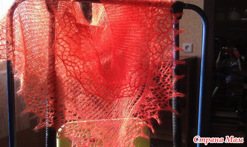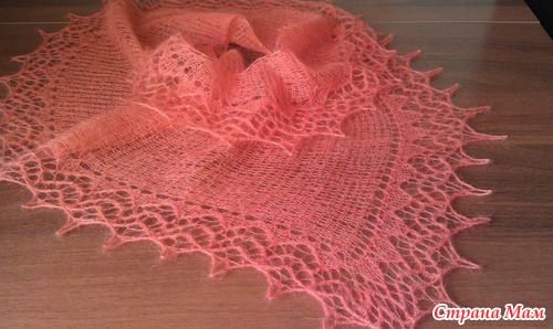 Это моя вторая фишю. Ушел ровно один моточек Alize Kid Mohair. Спицы 3,5, кайма на 3. По краю пустила чешский бисер № 7.