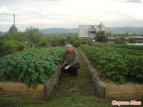 Каждая грядка - это 2 ряда картофеля, посаженная вдоль краёв в шахматном порядке 35 - 40 см между картофелями. В этой геометрии скрыт огромный резерв продуктивности, давно замечено: крайнее растение развивается чуть не вдвое лучше тех, что в середине – у них гораздо больше света и пространства для роста. А тут – все растения крайние. Широкое междурядье и нужно для того, чтобы дать им свет и простор. Маленькая площадь органики даёт больше, чем большая площадь почвы. Тот, кто хотя бы один сезон поработал на грядах, убеждается в огромных возможностях этого метода и уже просто не может вернутся к традиционной технологии. Работая на грядах, человек испытывает радость не только от хорошего урожая, но и от самого процесса выращивание овощей.