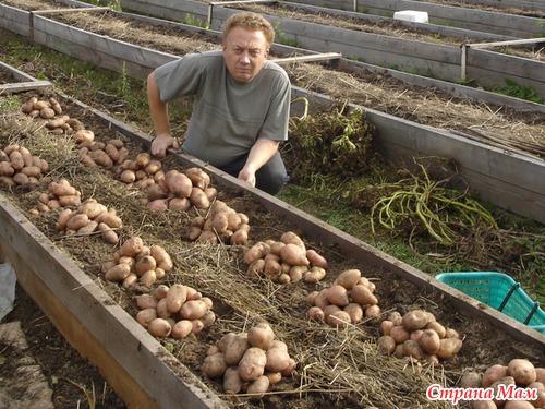 -Такая грядка работает несколько лет (пополнять её отходами, растительными остатками, после выкопки картофеля посеять сидераты и т. д.) При посадки картофеля не надо в лунку вносить ни компост, ни перепревший навоз. Такая грядка сама является компостом.