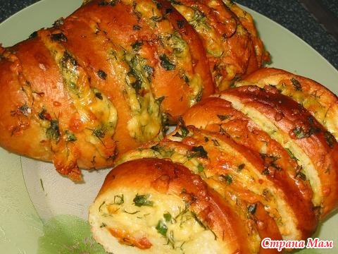 Завернуть батон в фольгу,поставить в духовку на 20 минут.Затем фольгу приоткрыть и оставить еще на 5 минут чтобы хлеб слегка подрумянился,можно под грилем.подавать можно порезав на ломтики по уже надрезанным линиям или порезать рядом острым ножом,тогда начинка останется как бы внутри.