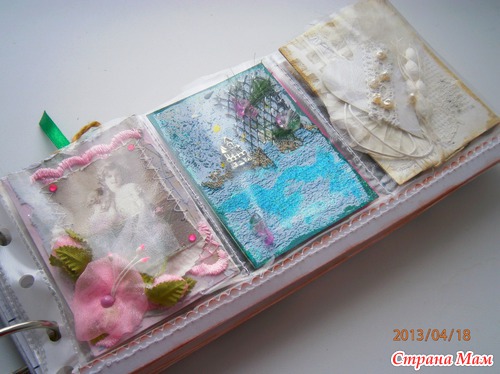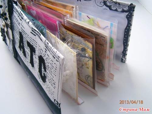 Вчера сделался вот такой альбомчик для моей небольшой (пока) коллекции АТС. Формат 24,5х11,5 примерно. В мягкой тканевой обложке. Закрывается на резинку. Внутри файлы разрезанные и прошитые по размеру. Низ каждого листа укрепила плотной бумагой. Альбом на кольцах, поэтому буду постепенно добавлять. Ну, и фото...