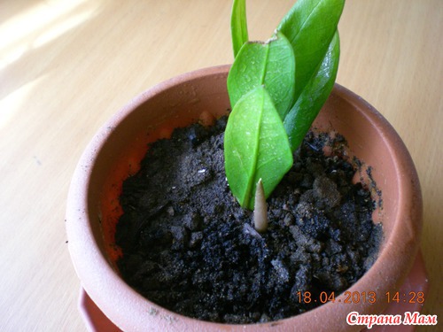 Прошлыи петом соседка по саду дала мне черенок замиокулькаса, а в простонародье – долларового дерева, и инструкцию по его размножению. Я посадила черенок и отрезала от него листок, т. к. есть способ размножения листочком. Лето, осень и зиму в горшочках не было никакого роста. Несколько раз порывалась выбросить, но черенок и листок крепко сидели в земле. Это удерживало от кардинальных мер.