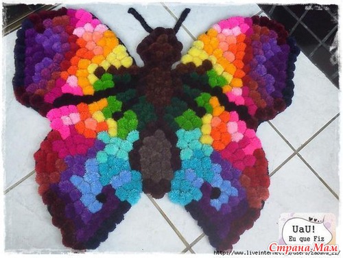 Самый лёгкий вариант для начинающих мастериц. Сначала вяжется основа (2 одинаковые), например тельце овечки, а потом пришиваются помпоны и овечка в шубке. Самое главное. чтоб помпончики были плотненькие и пришивать их надо почаще, чтоб коврик не приминался. Сборка: Сначала берется одна деталь основы и к ней привязываются или пришиваются помпоны между столбиками. Для образования неровного края привязывать 2 или более помпонов в одно отверстие основы. Пивязав все помпоны обрезать лишние нитки. Пришить сверху по краям 2 деталь основы. Это придаст прочность коврику и сделает аккуратной его изнанку.