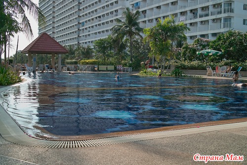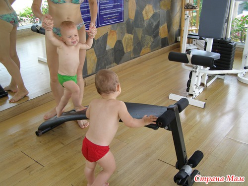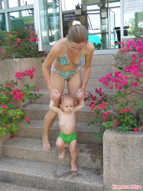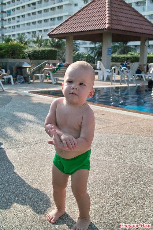 Конечно, есть дети более состоятельных семей – такие обычно ходят на море с родителями или играют на территории кондо. В бассейнах. =) Да, бассейны (в нашем было аж две штуки) – это палочка-выручалочка в таком климате. Мы посещали их, наверное, даже чаще, чем пляж. Не то, чтобы мы зажрались и море нам надоело, нет… мы конечно первым делом после заселения и еды пошли именно туда, и вечер на море был прекрасен. Однако следующим утром в воде плавало много мусора (наша Шамора вспоминается мне более чистой). Даже ноги ополоснуть не захотелось, не говоря уже о том, чтобы плавать там с дитём. Позже мы выяснили, что просто вышли во время прилива, который приносил откуда-то всё это. Через пару часов вода становилась чище, но наступала вообще нестерпимая жара, и время обеденного сна детей… короче, утреннее разочарование у моря подтолкнуло нас разведать бассейны. Они понравились и нам, и детям – в конце-концов, есть, где побегать, поплавать, есть ступеньки (!) – персональный пунктик моего дитяти со времён Японии (между прочим до сих пор актуален!), а так же душ, лягушатник для детишек, шезлонги и небольшие крытые комнаты с тренажёрами. Простор для выгула младенцев! =) Поначалу мы ходили просто так – плавали и лазили по тренажёрам. Потом, подсмотрев у других мам с детьми, начали приносить игрушки, и стало ещё веселее. )) Трудность была лишь в том, что надо как-то переодеваться после бассейна… а на это время обездвижить ребёнка было очень непросто. Мне пришлось применять загранпаспорта в качестве книжек с картинками (найди портреты мамы на многочисленных визах! работало очень долго, пока я не стала опасаться за сохранность документа), бутылку с питьевой водой (надо пить, причём так, чтобы вылить на себя, а потом на стул, а потом сквозь стул… и вообще всё вокруг облить), фотоаппарат (в те редкие моменты, когда я решалась взять сей хрупки девайс в бассейн), детская припевочка «где же, где наши уши?» (поёшь про все, что видишь, и быстро-быстро переодеваешься, пока дитю не надоест показывать на себе глаза-нос-рот и т. д... он кстати очень много частей тела изучил, благодаря этой припевочке).