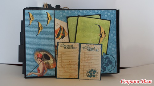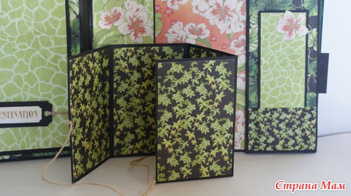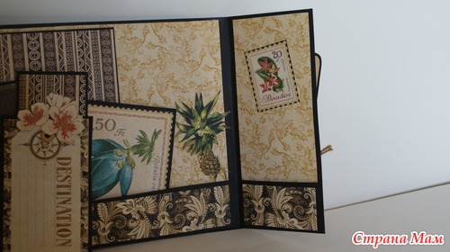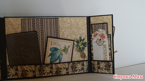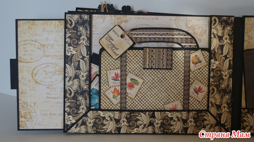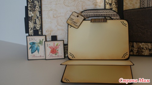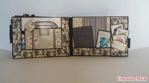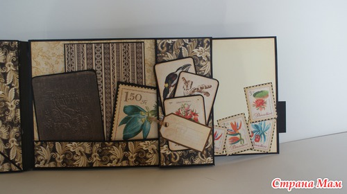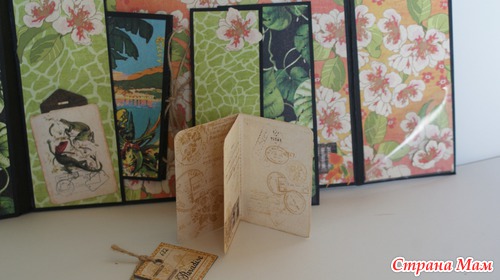 Вторая половинка с карманом, в котором книжка на 6 фото, тэги и еще одна маленькая книжка в виде паспорта