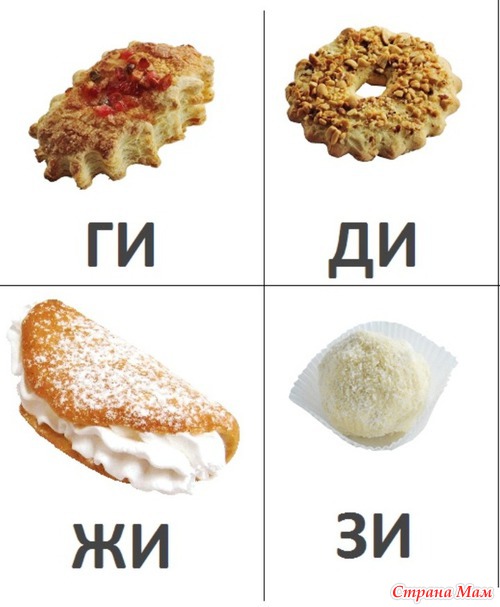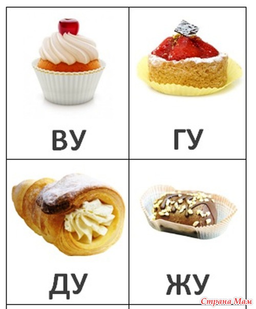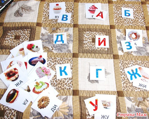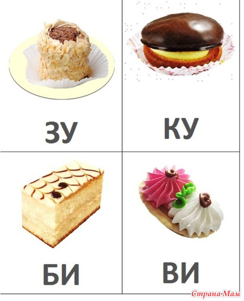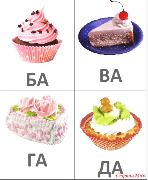 Делить их можно следующим образом: на каждой карточке с пирожным написан слог их 2х букв (взяла первые согласные буквы алфавита и 3 гласные произвольно). Пирожное можно отдать одной из двух букв, написанных на карточке (любой, по выбору). Например, на карточке с пирожным написан слог "БА", значит угостить этим пирожным можно букву А или Б. И т. д.
