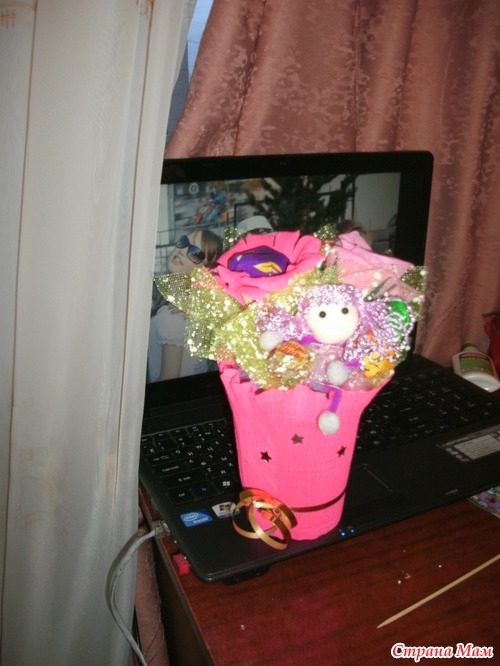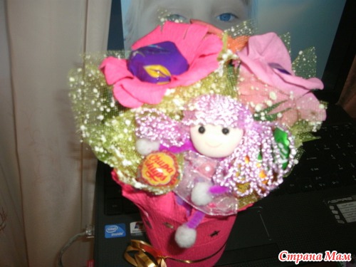 Попросила мне коллега сделать ее внучке на день рождения небольшой букетик. И вот такой букетик получился. Делала впервые. Не знаю как оценит хозяйка. В цветах конфеты "Машка на юге" и чупа-чупсы. Читать полностью