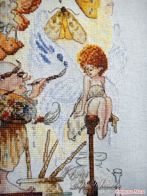 Произошел очень интересный эффект - область канвы в крылышках вышита частично,