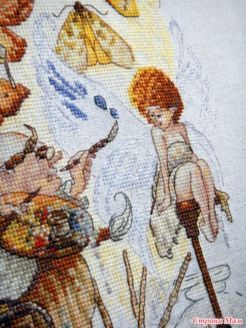 Произошел очень интересный эффект - область канвы в крылышках вышита частично,