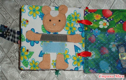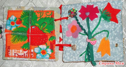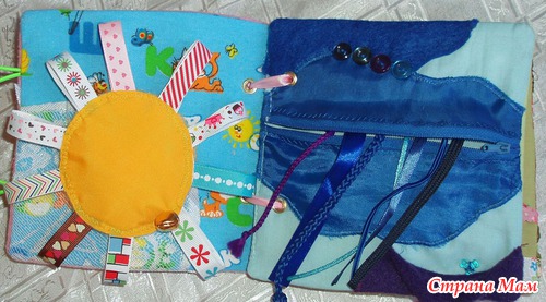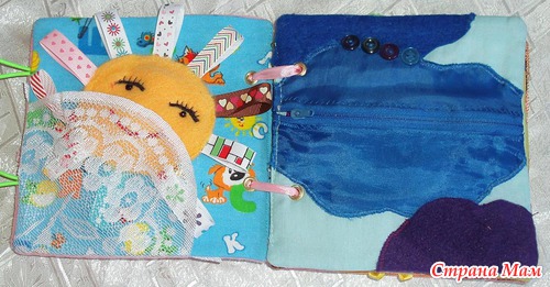 Страничка Солнышко Солнышко с разными лучиками из репсовых лент. Одна сторона флис, другая болонь. Бубенчик. Можно использовать как самостоятельную игрушку. Карман для погремушек. Ребенку будет интересно каждый раз видеть так что-то новое, будет пытаться достать.