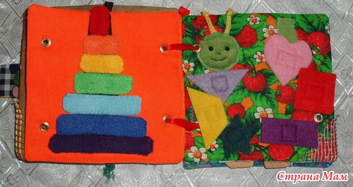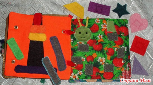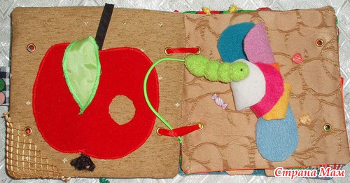 Страничка Яблоко Фон шершавый с блестщими пятнышками, яблоко мягкое, листик разный с каждой стороны вшита бусинка, можно катать. Персонаж гусеничка с шариками внутри может прятаться в яблоко, "есть" его.