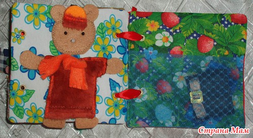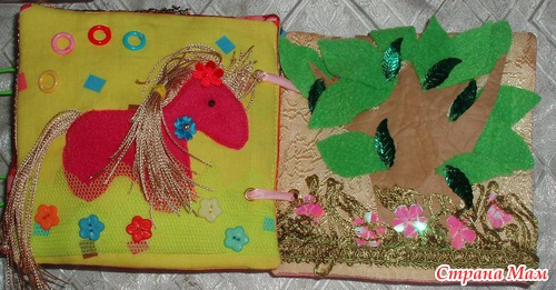 Страничка Лошадка мягкая, внутри нее пуговка, можно перемещать по телу лошадки. Грива и хвост их красивых шелковистых нитей, можно делать прически, завязывать. Также присутствуют разлиные цветы: бархатный, атласные, пуговки. Травка-сеточка. Колечки для шнуровки. Можно оформлять страничку по новому. Сначала ребенок будет выдергивать шнур, а в дальнейшем сам бедет учиться вставлять в колечки.
