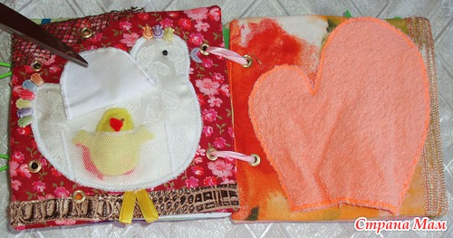 Страничка Варежка Варжека из крупной махры, внутри нашиты бусины в форме тор, которые при поглаживании переваливаются с боку на бок, также пришиты кусок губки и липки, пуговки и бусины.