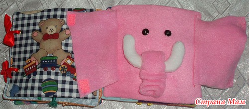 Сзади книжки "Розовый слон" карман ля фото и разные пуговки.