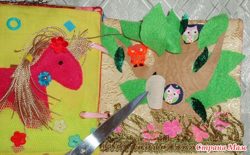 Страничка Совы прячутся в дупле и за листьями. Листики двух видов, для изучения понятий "твердый" - "мягкий". Цветочки-пайетки, можно считать. Дерево кожзам с интересной на ощупь фактурой. Травка-бахрома