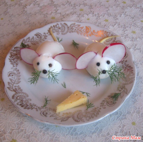 Опять я со своими кулинарными "творениями". На этот раз пробовала делать мышек. Идею подсмотрела в интернете. Но там глаза были использованы на клее и нос был сделан из швейной булавки. Я же хотела, что бы вся мышка была съедобной. Поэтому глаза и нос сделала из горошин черного перца(девчонки их потом просто вынули). И вот, что получилось.