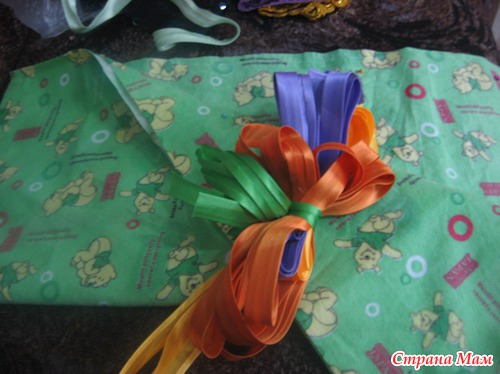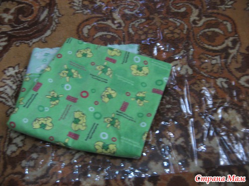 Мне понадобилось: материал, у меня остатки от пошива пеленочек; клеенка-очень хорошего качества, она плотная, мягкая, у нас метр такой клеенки стоит 400 тенге, это не дешево, зато очень практично, клеенка мягкая, не шелестит; косая бейка; нитки; машинка.