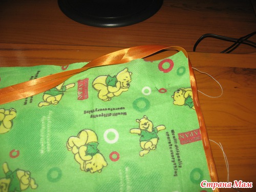 Затем все складываем бутербродом: материал+клеенка+материал и пришиваем косую бейку, сначала я прошила на руках, затем на машинке.